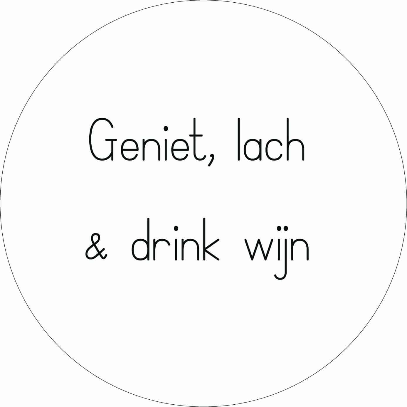 Muurcirkel Geniet, lach & drink wijn wit ook wel wandcirkels, wooncirkels of roundies genoemd, zijn helemaal hip op dit moment! Deze wanddecoratie is ook nog eens zeer betaalbaar! Onze muurcirkels zijn gemaakt van forex. Forex is een materiaal van licht pvc, met een harde toplaag. Door het materiaal is de cirkel licht buigbaar en weegt het bijna niets! Onze cirkels tot en met 40 centimeter worden ook zonder bevestigingsmateriaal verzonden. De cirkels kunnen makkelijk opgehangen worden met dubbelzijdige tape dat geschikt is voor jouw type ondergrond. Tesa heeft verschillende tapes hiervoor. Muurcirkels vanaf 50 cm verzenden wij rechtstreeks vanaf de drukkerij en worden geleverd met een ophangplaatje en afstandhouders.