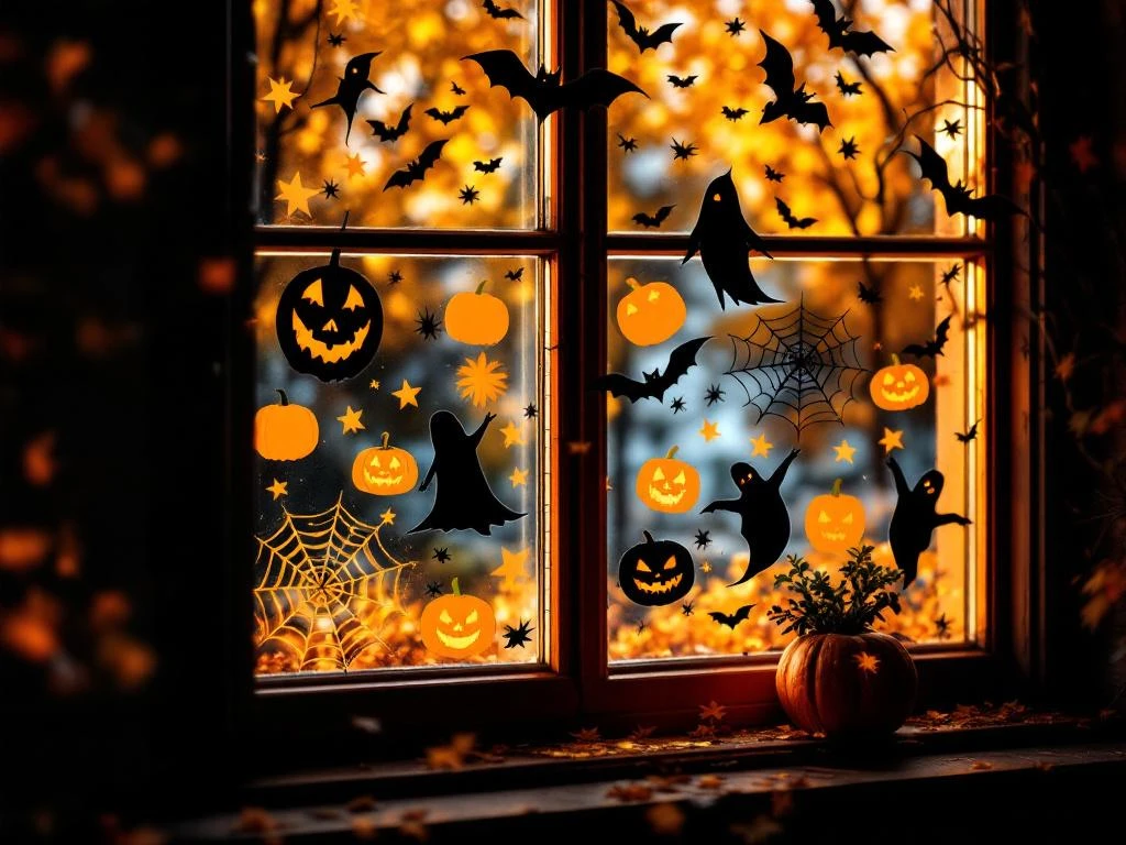 Combineer verschillende maten voor het beste resultaat. Een grote sticker van 25×25 cm als middelpunt, omringd door kleinere stickers van 8×8 cm tot 12×12 cm, creรซert een dynamische en interessante halloween raamsticker collectie.